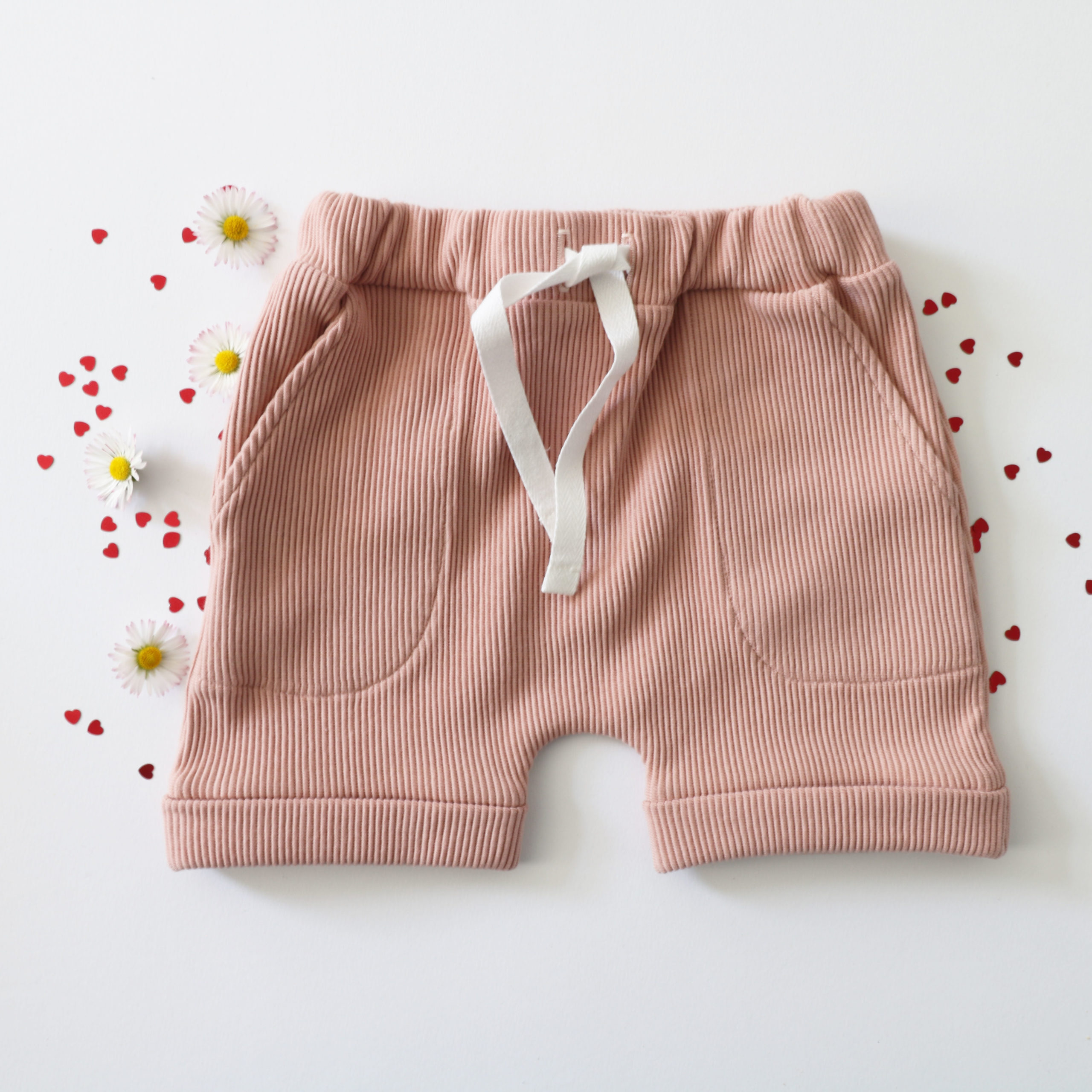 Ce petit short est confectionné dans un jersey de couleur rose. Le short se compose de deux poches sur le devant. Une ceinture avec un élastique facilite l’habillage et le confort de bébé. Il comporte un cordon à nouer pour resserrer la taille.